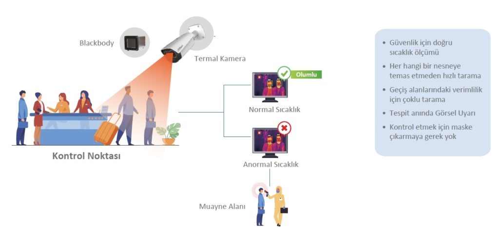 Termal kameralar, yapay zeka algolaritması sayesinde 3mt mesafeye kadar hızlı ve temassız ölçüm yapıp Blackbody cihazı ile son derece hassas (±0.3°C’ye kadar) vücut sıcaklıgı ölçümü yapabilir.